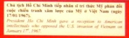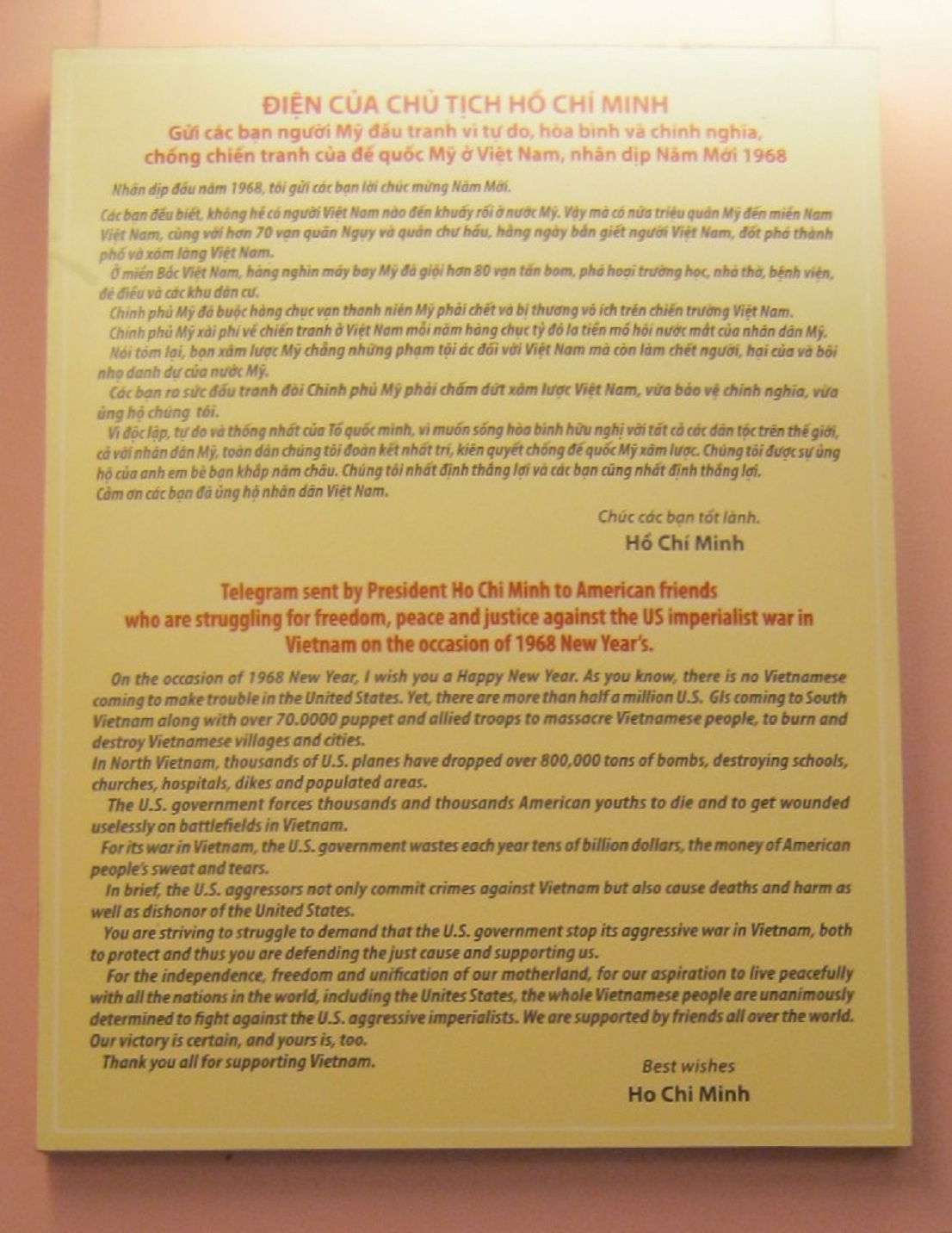 "Zum Neujahr 1968 wünsche ich euch ein fröhliches, neues Jahr. Wie ihr wisst, ist bis heute kein Vietnamese in den "USA" erschienen, um dort Unruhe zu stiften. Bis jetzt sind über eine halbe Million GIs der "USA" nach Südvietnam gekommen, zusammen mit über 70.0000 Puppentruppen und alliierten Truppen, um das vietnamesische Volk zu massakrieren, um vietnamesische Dörfer und Städte abzubrennen und zu zerstören.
