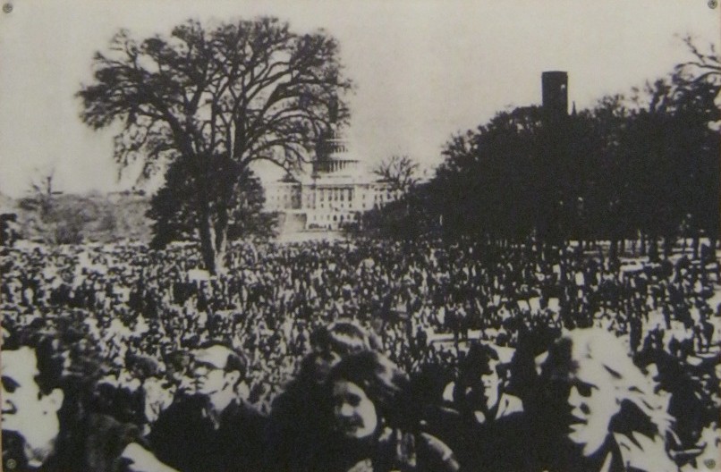 Text: Beim Marsch vom Nationalfriedhof Arlington zum Capitol in Washington nahmen 45.000 bekannte "Amerikaner" teil. Jeder Teilnehmer trug ein Schild mit einem getöteten GI-Soldaten oder eines zerstörten, vietnamesischen Dorfes.