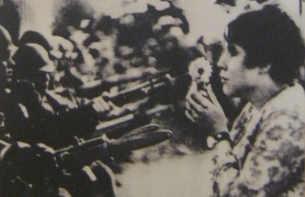Text: Jan Rose Kasmir hält an der Demonstration gegen den Vietnamkrieg vom 21. Oktober 1967 in Washington den bewaffneten Garden eine Blume entgegen, und dieses Foto wurde fortan ein Symbol für ein Gebet für Frieden.