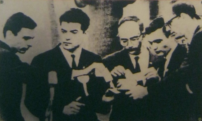 Text: Hier ist das Bild des jungen R. Laporte, 22 Jahre alt, er begoss sich mit Flugtreibstoff und verbrannte sich selbst vor dem Hauptquartier der UNO, als Protest gegen den aggressiven "US"-Krieg in Vietnam.