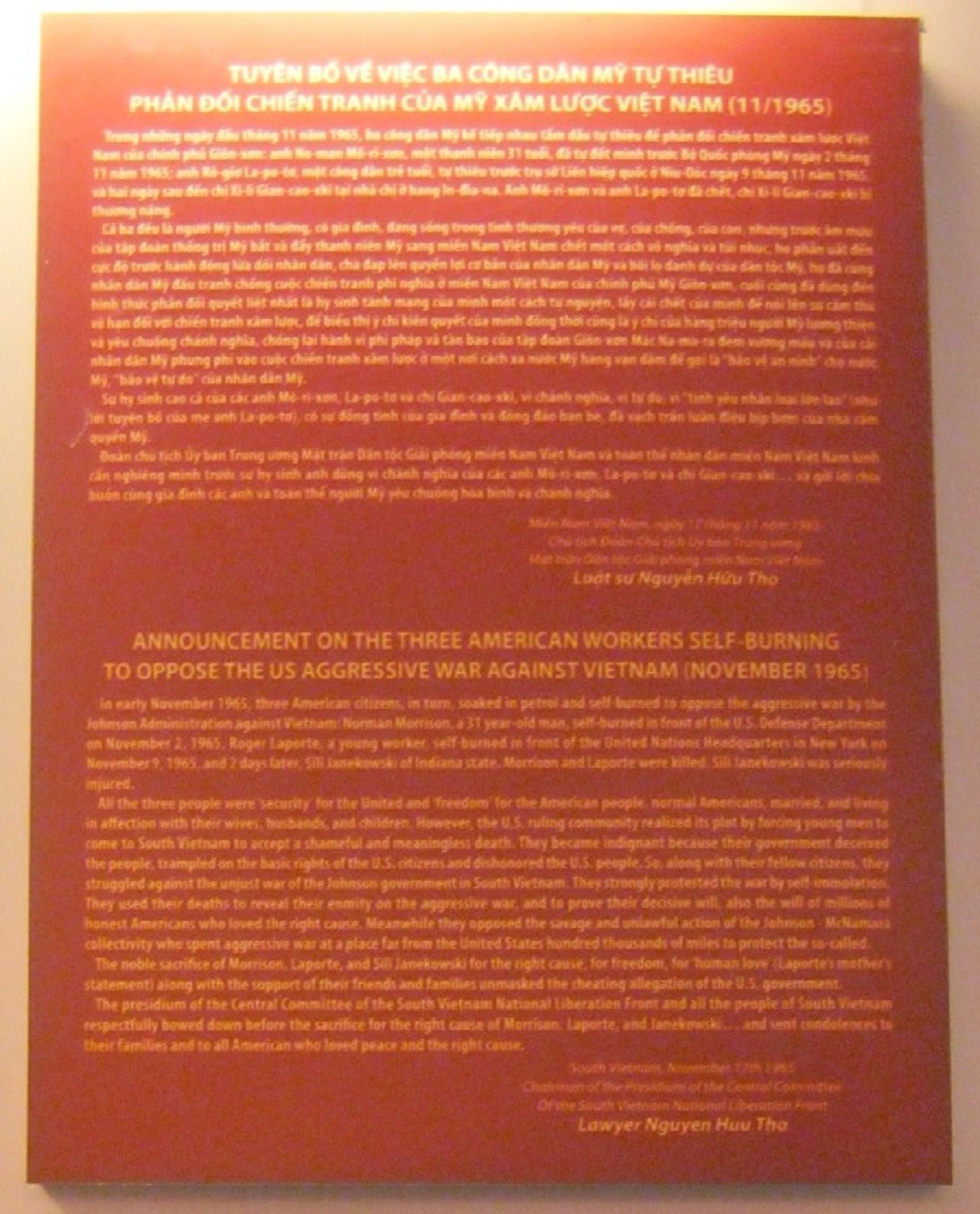 Der Bericht des vietnamesischen Anwalts Nguyen Huu Tho über 3 "amerikanische" Arbeiter mit Selbstverbrennung als Widerstand gegen den aggressiven "US"-Krieg gegen Vietnam: Norman Morrison (2.11.1965) - Roger Laporte (9.11.1965) - Sili Janekowski (11.11.1965)