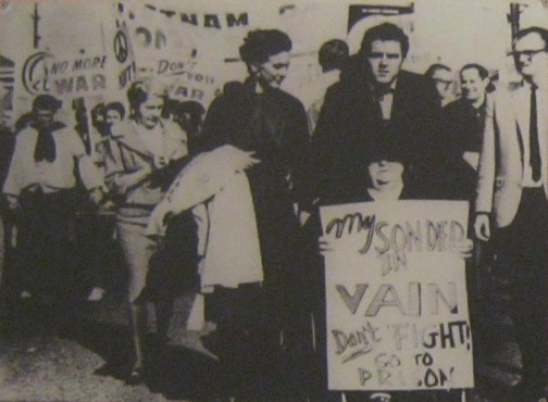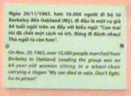 Text: Am 20. November 1965 marschierten über 10.000 Menschen demonstrierend von Berkeley nach Oakland. In der vordersten Reihe war eine 84-jähriege Frau im Rollstuhl mit einem Schild mit dem Aufruf: "Mein Sohn starb vergebens. Hört auf zu kämpfen, geht ins Gefängnis".
