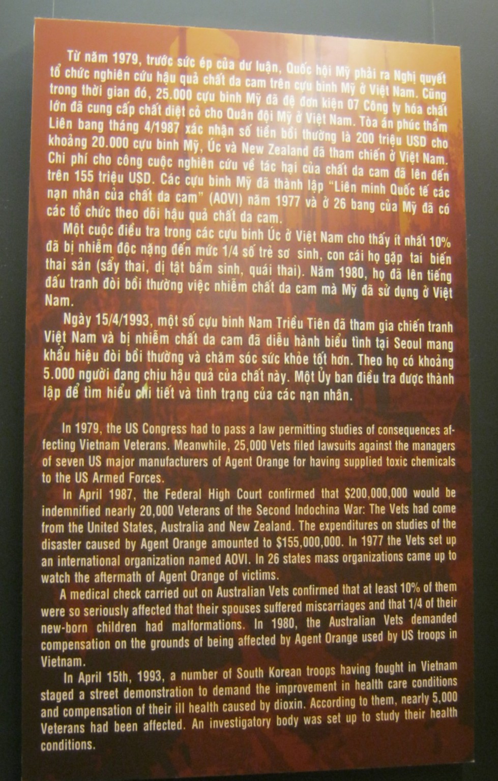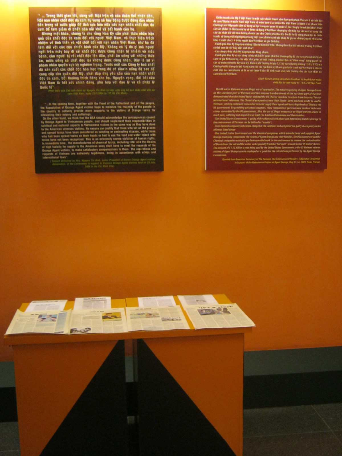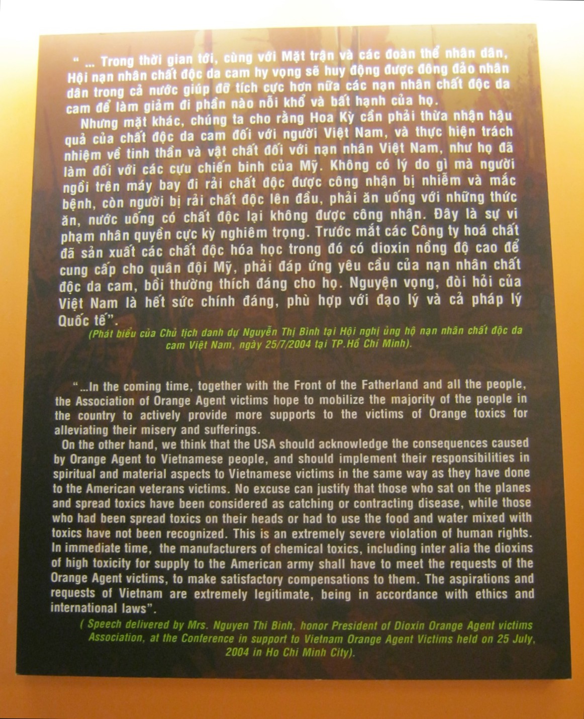 Por otro lado, pensamos que los "EUA" debe aceptar las secuelas que el Agente Naranja ha causado en la población vietnamita y debe asumir sus responsabilidades, tanto en el aspecto espiritual como material, a favor de las víctimas vietnamitas, al igual que ha indemnizado a las víctimas veteranas "americanas". No existe ninguna disculpa para justificar que unos reciben compensación cuando fueron trabajando con el Agente Naranja en aviones rociando el tóxico en el aire pero que la gente en el campo o gente que ha comido comida y agua contaminada no recibe nada. Las enfermedades son graves y la violación de los Derechos Humanos es grave. Entretando las empresas de pesticidas que tienen productos de dioxina altamente tóxicos y que han suministrado eso al ejército "americano" deberían contestar a preguntas de las víctimas de Agente Naranja para pagarles una compensación satisfactoria. Las reclamaciones y demandas de Vietnam están extremadamente justificadas, de acuerdo con la ética y el derecho internacional."