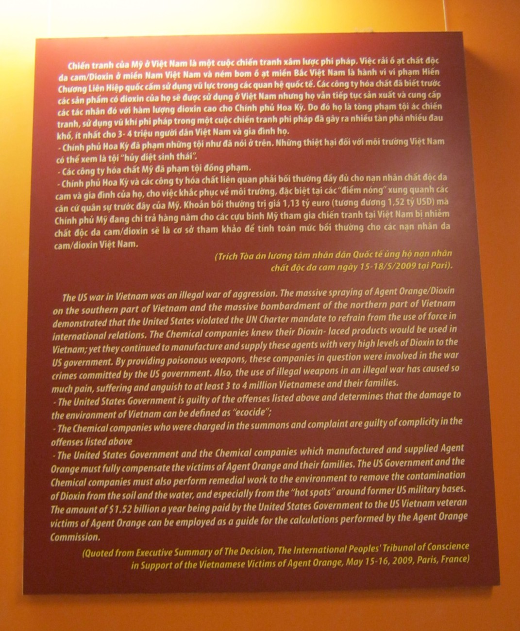 "La guerra de los "EUA" en Vietnam fue una guerra ilegal de agresión. La fumigación masiva de pesticidas con Agente Naranja o dioxinas en Vietnam del Sur y los bombardeos masivos en Vietnam del Norte nos muestran que los "EUA" ha violado el mandato de la Carta de las Naciones Unidas de abstenerse de la violencia en las relaciones internacionales. Las compañías farmacéuticas conocían la existencia de la dioxina: en Vietnam se consumían paquetes enteros de mercancías; pero la producción para el gobierno de "EUA" continuó, a pesar de que el contenido de dioxinas era muy alto. Al suministrar armas envenenadas, estas compañías farmacéuticas estuvieron involucradas en los crímenes de guerra cometidos por el gobierno de "Estados Unidos". En general, fueron armas ilegales en una guerra ilegal las que causaron mucho dolor, sufrimiento y tortura con al menos 3 o 4 millones de vietnamitas y sus familias.